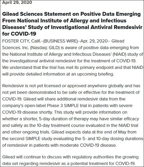 北京时间4月29日晚, 吉利德科学公司也公布了一项瑞德西韦的新冠肺炎重症患者临床试验结果。