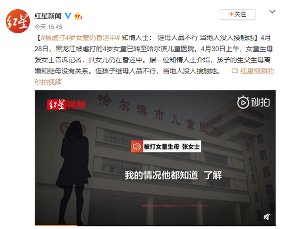 4月28日,黑龙江被虐打的4岁女童已转至哈尔滨儿童医院。4月30日上午,女童生母张女士告诉记者,其女儿仍在昏迷中。据一位知情人士介绍,孩子的生父生母离婚和继母没有关系。但孩子继母人品不行,当地人没人接触她。