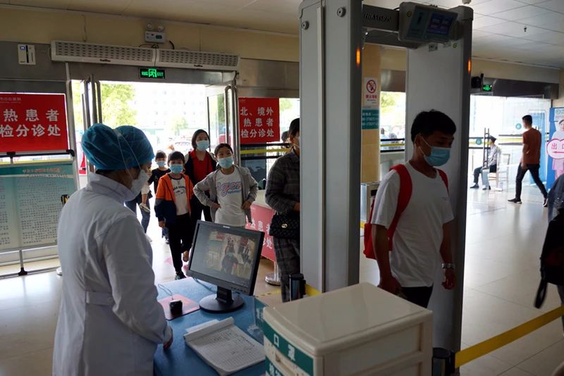 医院门诊大楼前,已经有不少患者和家属在医护人员、医院志愿者和保卫人员的引导下,井然有序的排队着,每个人都戴着口罩,间隔一定的距离,有序地在医务人员的引导下,通过测温走廊设置红外测温门,进行体温监测。