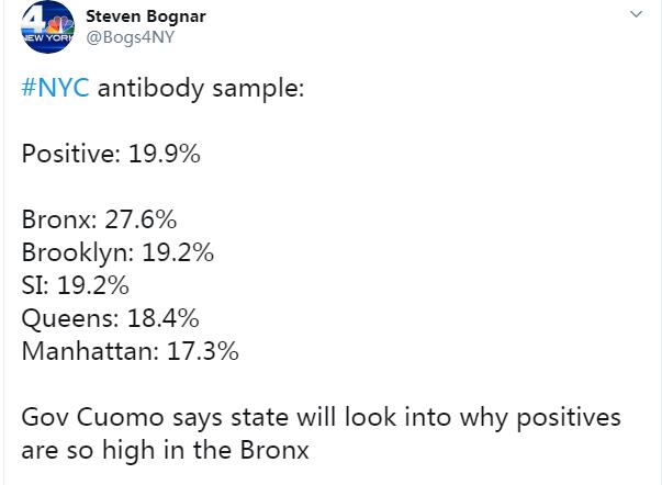在纽约市,该样本中19.9%呈现阳性。该市各区方面,布朗克斯为27.6%;布鲁克林为19.2%;SI为19.2%;皇后区为18.4%;曼哈顿为17.3%。科莫表示纽约州政府将调查为何布朗克斯区的阳性比例如此之高。(海外网 侯兴川)