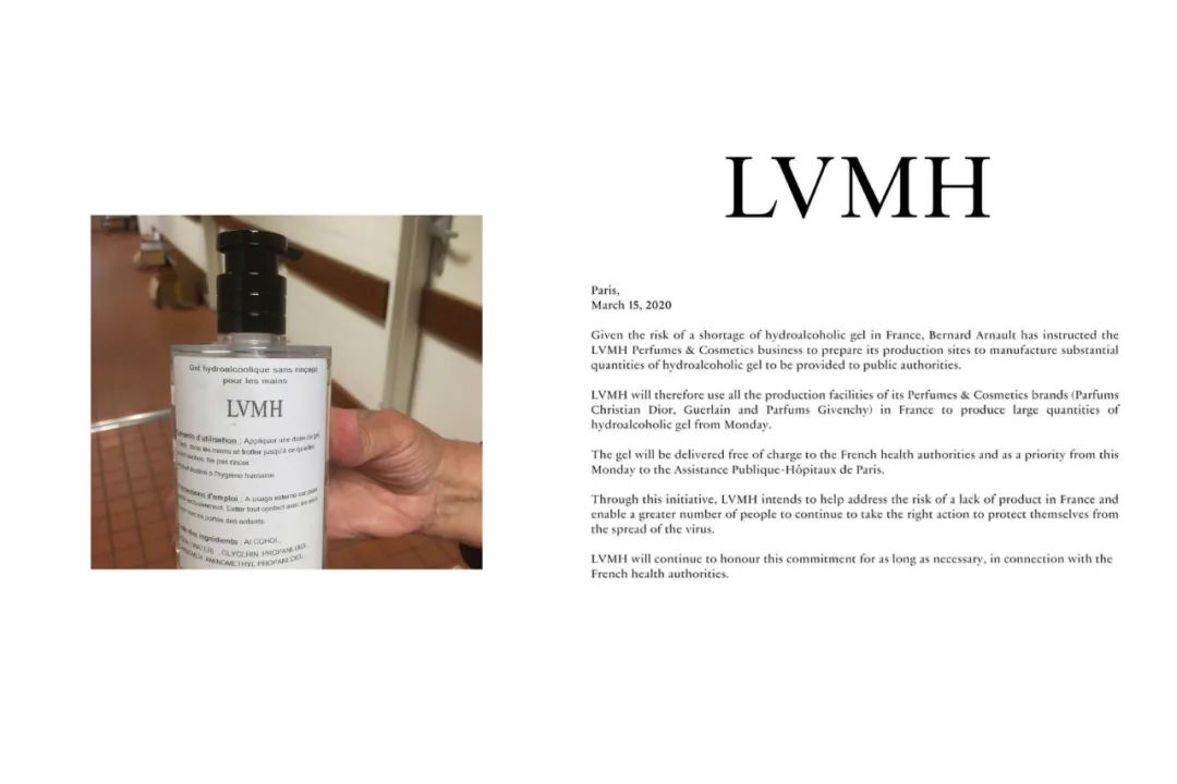 LV母公司,法国奢侈品巨头LVMH最近宣布了旗下香水和化妆品生产工厂将开足马力生产洗手液,使更多的人能够继续采取正确行动,保护自己不受病毒传播影响,这些酒精洗手凝胶会向法国卫生部门和医院免费提供,以帮助应对新冠疫情造成的此类产品短缺。