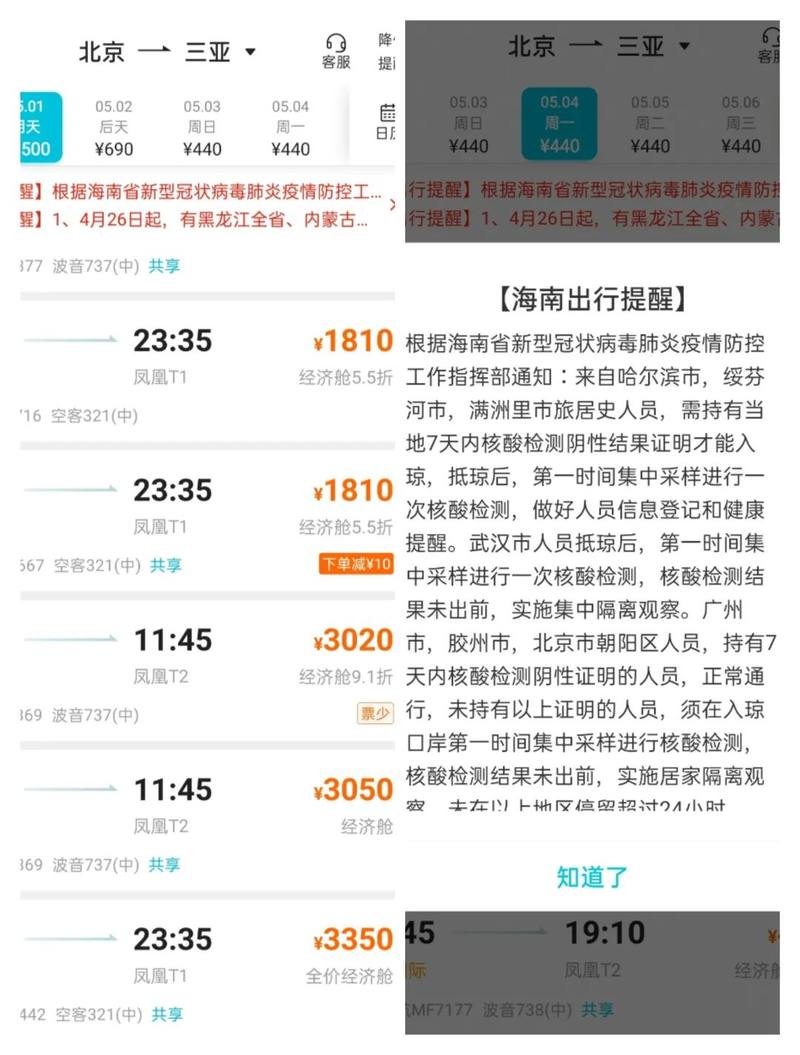 4月30日,三亚到北京的部分飞机票涨到了3000元以上,但仍被提醒中高风险地区需要提供7天以上核酸检验证明才能进入海南省。