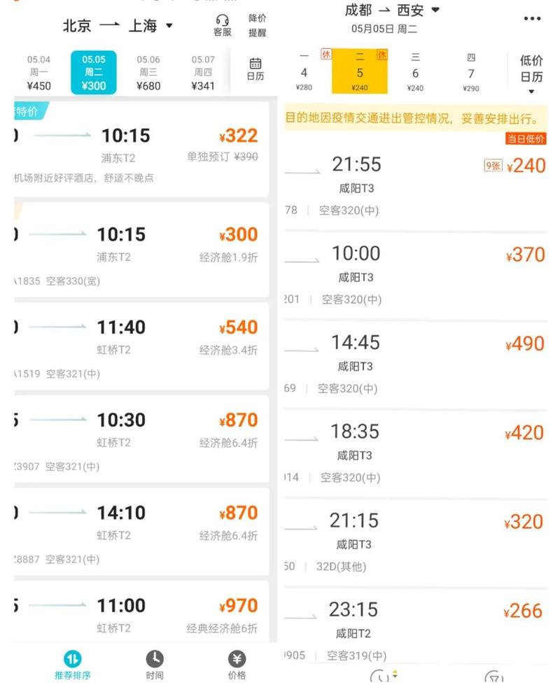 北京到上海机票六折;成都到西安部分机票降至300元以下