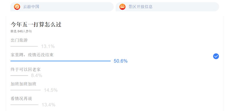 不过,腾讯新闻上的一个投票显示,50%的人选择宅在家,选择旅游的人占比13%,差距明显。