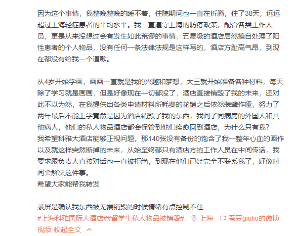 原标题:回国留学生确诊住院, 行李却被酒店销毁!护照签证和140张画作全没了...