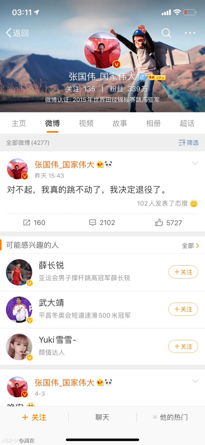 虎扑5月1日讯4月5日,跳高名将张国伟在微博发文退役,他表示:对不起,我真的跳不动了,我决定退役了。微博发出后引起了网友的讨论,具体内容如下: