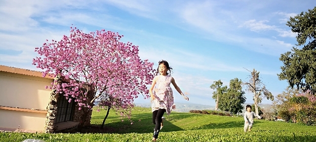 (3月23日,姐弟俩在家外面的草地奔跑。宅在家里的这段时间,俩人感情更深了。)