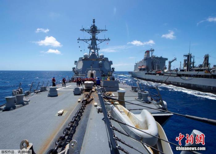 图为3月27日,“基德”号从补给油船上接收燃料。
