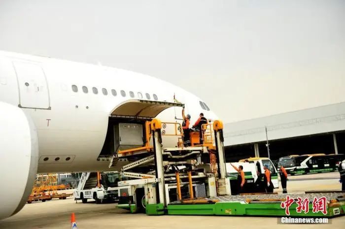 资料图:一架国际临时包机在广州白云国际机场货机坪“自提”22吨防疫物资后将飞往埃及开罗。