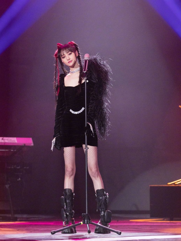 这身朋克风的造型似乎突破了她以往的风格,黑色的紧身短裙凸显好身材,网纹袜和黑色高筒靴十分帅气个性。而两个长长的辫子扎成蝴蝶结形状,更是带来少女的感觉。