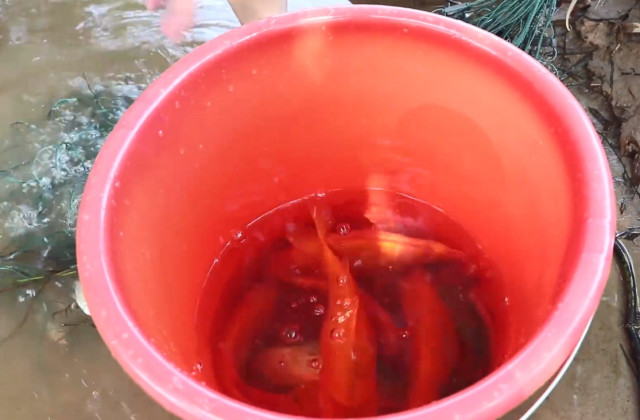 河里的红鲤鱼非常多,当小伙有捕捞到一条的时候就会有另一条被小伙发现,后面的红鲤鱼在捕捞的时候已经是有了第一条的经验,搞起来也是要快捷许多。在这河里搞了个把小时的时间,也是搞到了好几条红鲤鱼,而最初放置的拉网,小伙拉出来后也是有收获到了好几条小鲫鱼。不得不说这样子的收获真的很不错了。