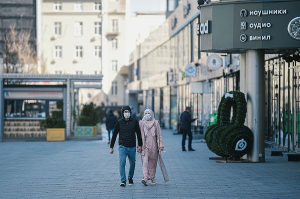 近日,在俄罗斯首都莫斯科,人们佩戴口罩出行。新华社发