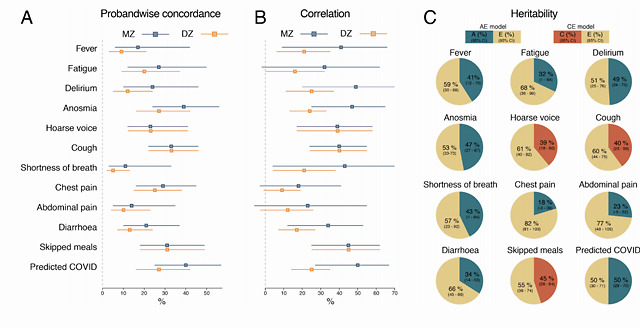 通过对数据进行统计分析,研究者发现各种COVID-19症状与遗传的相关性如下: