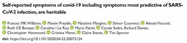 上发表了题为:Self-reported symptoms of covid-19 including symptoms most predictive of SARS-CoV-2 infection, are heritable 的研究论文。