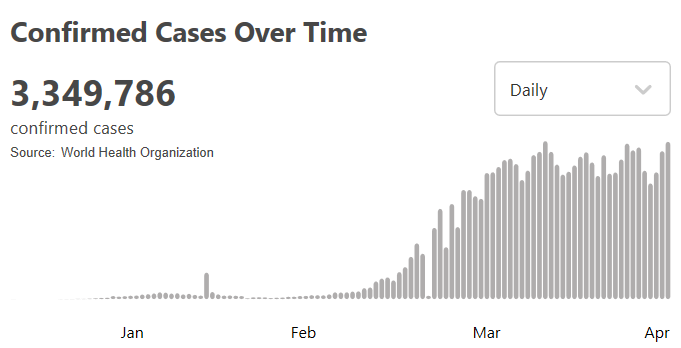 世卫组织:全球新冠肺炎近335万例