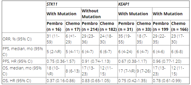 结果:34%(429例/1274例)患者的肿瘤和配对DNA具有可评估的WES数据。分别在33例(8%)和64例(15%)患者中发现STK11突变和KEAP1突变,12例(3%)患者同时存在这两种突变。与无STK11突变患者相比,STK11突变患者的PD-L1 TPS水平更低,中位IQR分别为15%和40%,有和无KEAP1突变患者的PD-L1 TPS水平相近,中位IQR分别为40%和40%。与无STK11突变患者相比,STK11突变患者的TMB水平更高,中位IQR分别为191和146,与无KEAP1突变患者相比,KEAP1突变患者的TMB水平也更高,中位IQR分别为183和142。在有和无STK11或KEAP1突变的患者中,帕博利珠单抗患者的ORR、PFS和OS结果相当。与无STK11突变的患者相比,STK11突变的患者的化疗疗效更低(见下表)。不论STK11或KEAP1突变状态如何,帕博利珠单抗对比化疗有更好的预后(见下表)。