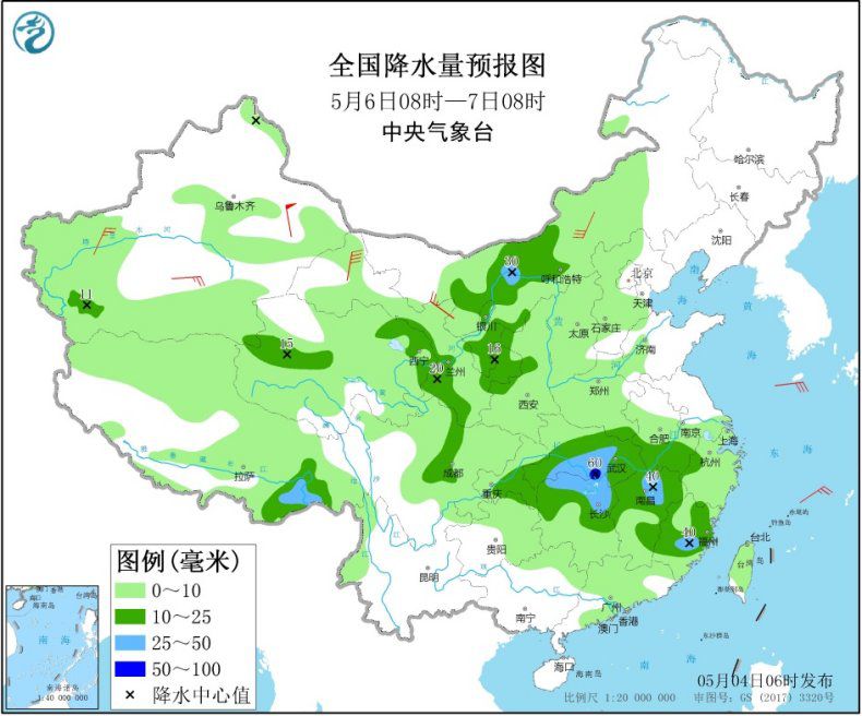 5月6日08时至7日08时,内蒙古中西部、西藏东部、青海东部和西部、西北地区东部、江淮西部、江汉大部、江南北部和中部、重庆中南部等地部分地区有中到大雨,其中,湖北南部、湖南北部等地部分地区有暴雨(50~60毫米)。内蒙古中部、新疆南部等地部分地区有4~6级及以上风,其中,甘肃河西部分地区有6~7级风,新疆东部部分地区有7~8级风(见图3)。