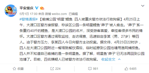 5月1日下午,重庆市公安局官方微博“平安重庆”发布警情通报,4月25日上午,大渡口区警方接报警,称该区公园一条明星鲤鱼“莽子”被人偷走。“莽子”系一条重约40斤的鲤鱼,是大渡口公园的名片,深受游客喜爱,牵挂着很多市民的情怀。大渡口区警方通过调取监控、走访调查、迅速锁定李某(男,27岁)等四人。迫于警方压力,李某四人今日向警方主动投案。