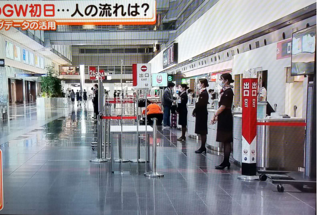 羽田机场旅客大为减少。 电视报道画面