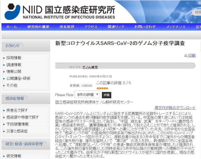 国立感染症研究所是日本最权威的病毒研究机构。日本早期的病毒检查、防范均由该机构领导实施。该研究所与地方卫生研究所合作,采集各地感染者病毒并作基因排列分析,结果显示从武汉传入日本的病毒感染病例已经消失。因此,将其称为感染“第1波”。分析显示,3月份以来日本各地发生的路径不明感染病例,是源自欧美流入的病毒株,并引发了第2波感染。