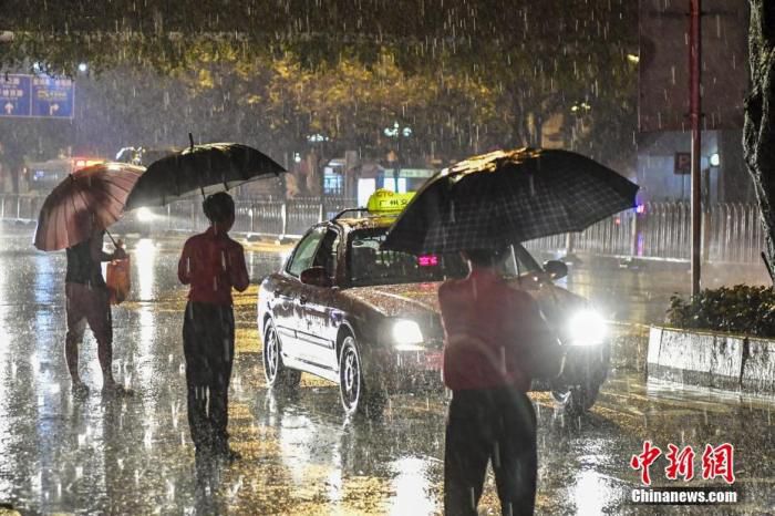 资料图:广州市民冒雨在路边等待出租车。中新社 记者 陈骥旻 摄