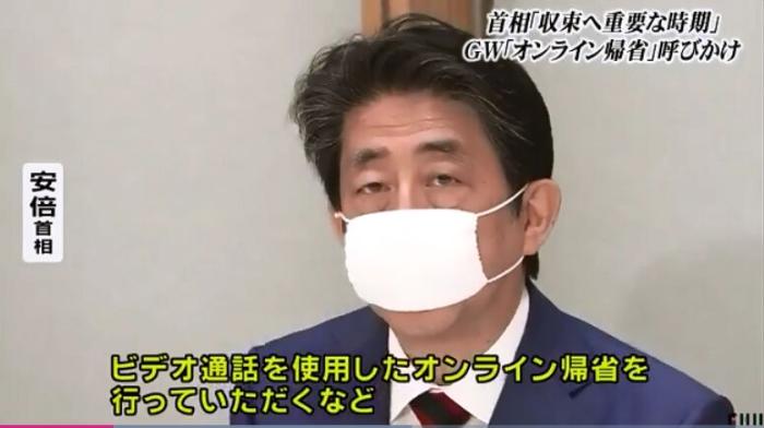 22日,日本首相安倍晋三呼吁民众黄金周期间减少出行,尽量“云探亲”。(图片来源:日本富士电视台视频截图)