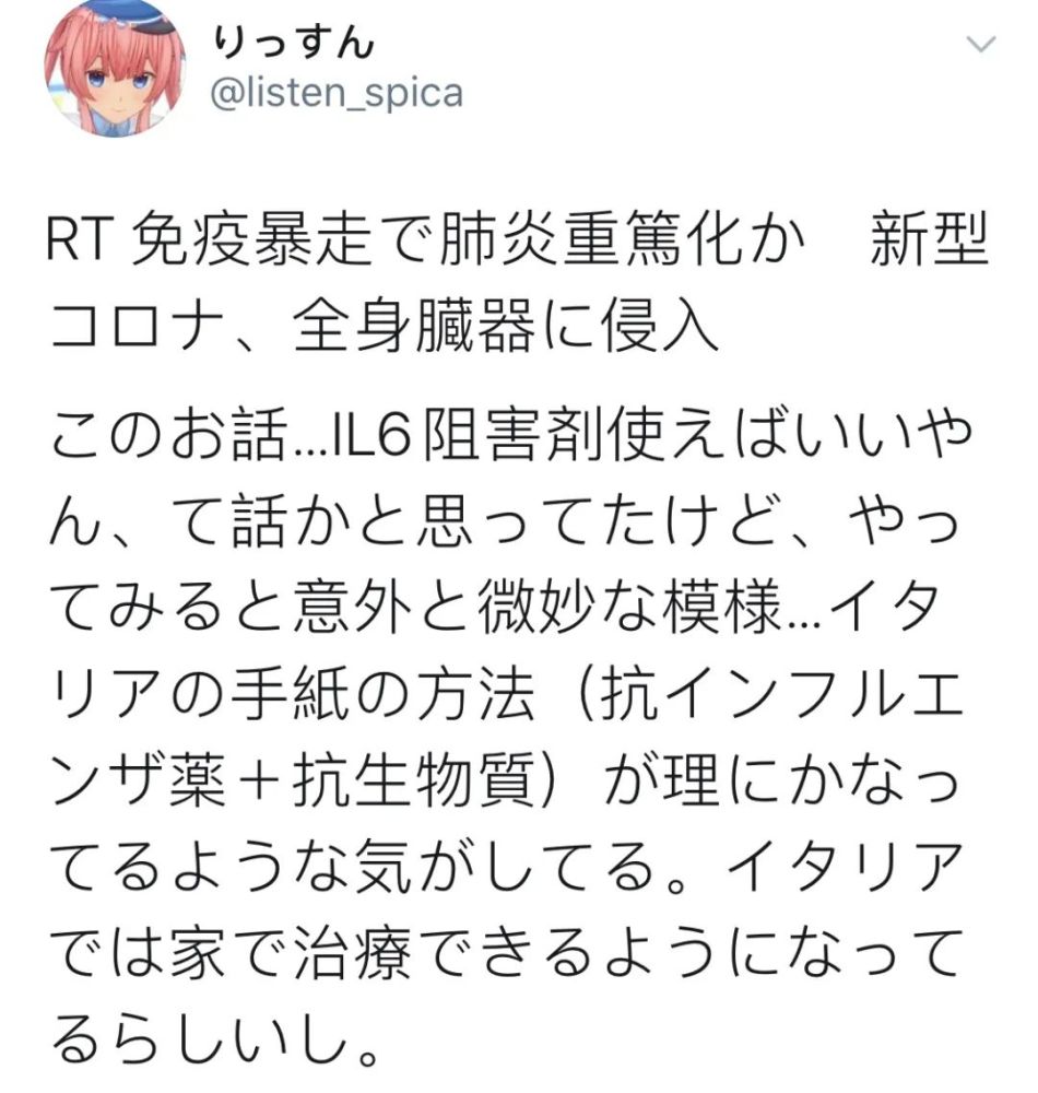 照那么说的话,我本来以为IL6抑制剂效果会好,但尝试使用的时候可能会出现意外又微妙的模样。意大利的方法(抗流感药物+抗生素)似乎有意义。意大利有可能在家里进行治疗。