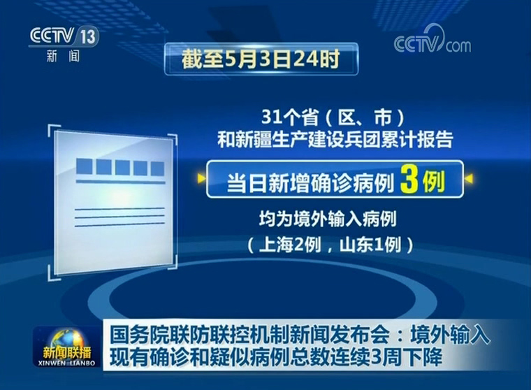 截至5月3日24时,31个省(区、市)和新疆生产建设兵团累计报告确诊病例82880例,其中累计报告境外输入确诊病例1675例;当日新增确诊病例3例,均为境外输入病例;现有确诊病例481例,其中重症病例33例;累计死亡病例4633例,当日无新增死亡病例;累计治愈出院病例77766例,当日新增53例;现有疑似病例3例,当日新增疑似病例1例,为境外输入疑似病例。截至5月3日24时,现有境外输入确诊病例402例,其中重症病例5例;现有疑似病例3例,累计治愈出院病例1273例,无死亡病例。5月3日0至24时,新增接受医学观察的无症状感染者13例,其中境外输入2例;无当日转为确诊病例;尚在医学观察的无症状感染者962例,其中境外输入98例。