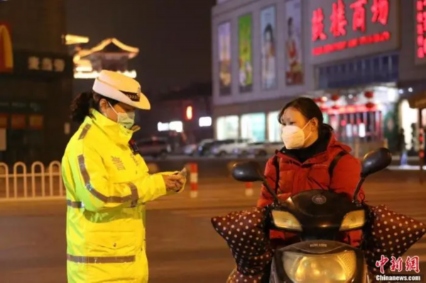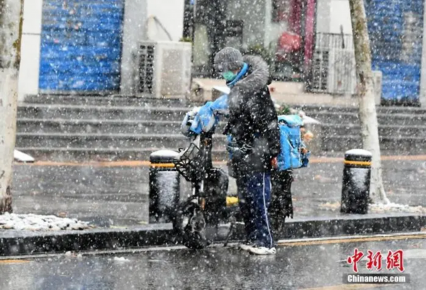 资料图:2月15日,环卫工人、交警在雪中忙碌,外卖小哥仍在为市民送单,小区工作人员也在风雪中坚守岗位。中新社记者 安源 摄