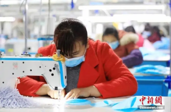 资料图:2月11日,在广西柳州市融安县长安镇隘面村扶贫微车间,工人们加紧生产口罩。中新社发 谭凯兴 摄 图片来源:Cnsphoto 远在外地的菜农看到消息纷纷拿出自家菜园子的蔬菜、水果支援湖北的兄弟姐妹