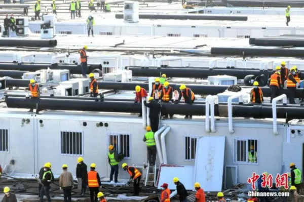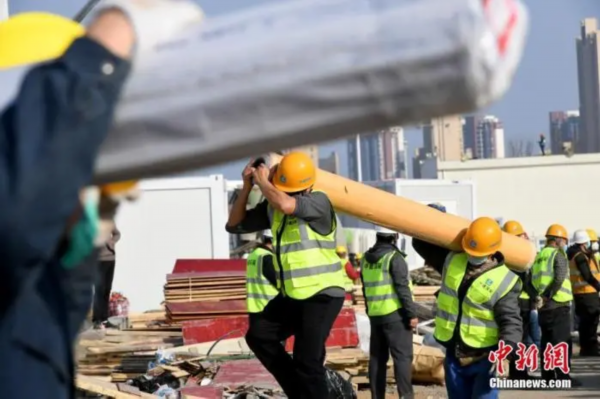 资料图:1月31日,武汉雷神山医院施工现场,各项施工项目在全速推进中。中新社记者 安源 摄 基层干部、警务人员24小时待命拉网排查、执勤巡逻、宣传防控知识社区工作者值守在每一个社区入口买药送菜、清洁消杀、守候万家灯火
