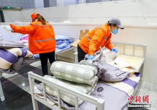 资料图:2月4日晚,武汉市国际会展中心方舱医院里,施工人员仍在现场进行水电、木工等工程施工,环卫工人们正在现场装订床铺、整理被套。中新社记者 安源 摄 而在另一个抗疫现场还有许多劳动者在忙碌着科技工作者日夜奋战开展病毒溯源、流行病学调查积极攻关药物和疫苗研发