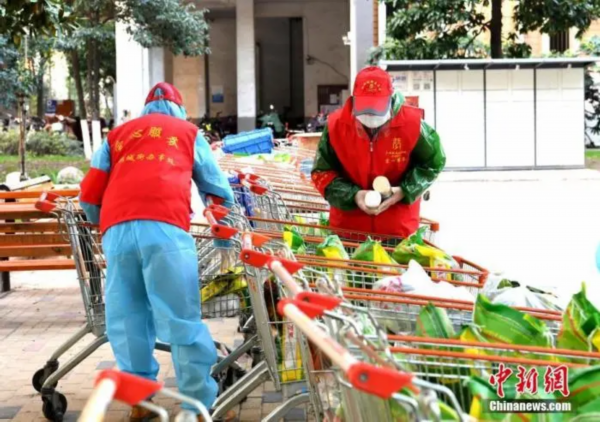 资料图:武汉市青山区红钢城街道青扬社区工作人员清点为居民购买的生活必需品。中新社记者 安源 摄 许多快递小哥、义工、志愿者穿梭在武汉三镇的大街小巷自发运送医护人员和物资安慰鼓励治疗中的患者为大家提供种种力所能及的帮助