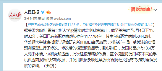 原标题:美国新冠感染病例超过117万,新模型预测美国8月初死亡病例将超13万