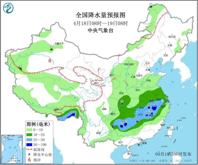 今天,西南地区东部、江南和华南等地将有较强降雨,预计贵州东南部、广西东北部、湖南中部和东北部、湖北东南部、江西中北部、安徽南部、浙江西部等地的部分地区有大雨,局地暴雨;上述部分地区伴有短时强降水,贵州东部、广西北部、湖南中南部、江西中北部等局地有雷暴大风或冰雹。另外,20至21日,江南、华南、四川盆地东部及贵州又将有一次中到大雨过程,局地暴雨。
