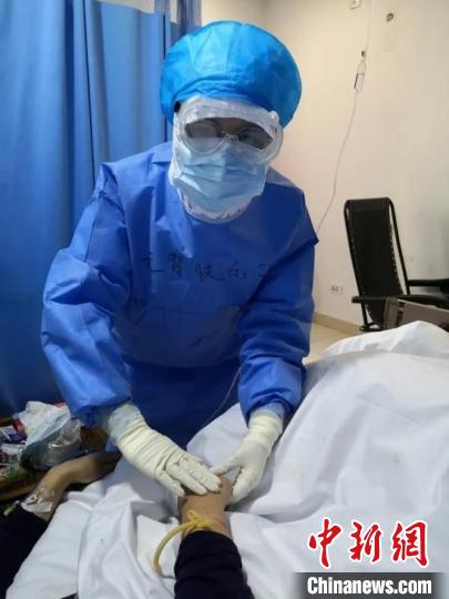 在武汉支援医院病房,刘婷婷正在给患者静脉输液穿刺。受访者供图