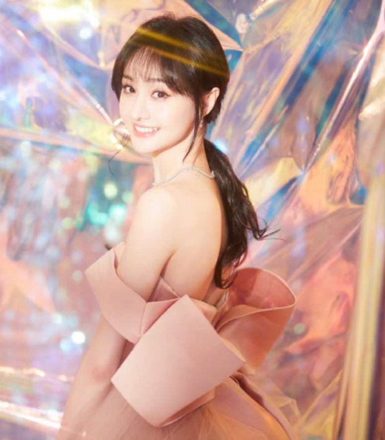 郑爽穿粉色蝴蝶结纱裙图片 穿樱花色礼裙 对镜甜笑温柔大方