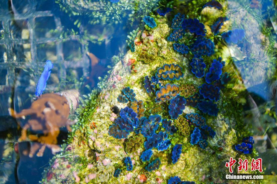 4月28日,陆基珊瑚及砗磲培育基地玻璃水箱中人工培育的珊瑚。在海南省万宁市山根镇排溪村有一所建在陆地上的“海洋牧场”――陆基珊瑚及砗磲培育基地,这里人工培育的珊瑚、砗磲、海藻、鱼类,构成一个小型生态系统,经过食物链多重滤食,最终实现污染物零排放、养殖零用药。长大的珊瑚、砗磲最终放流大海,用于修复海洋生态环境。中新社记者骆云飞摄