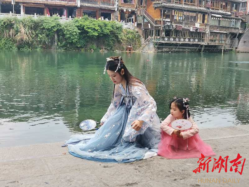 “五一”小长假,凤凰古城内也出现了很多穿着汉服的小仙女,各家汉服租赁店也是生意爆满。商家表示,现在游客十分会“玩”,来景区前都会做好功课,来到古城“自编自导自拍”,通过视频直播、发朋友圈、传抖音等方式打卡留影。