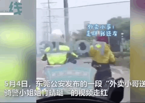 “外卖小哥送铁骑小姐姐竹蜻蜓”的视频