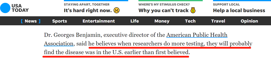 3月底,美国公共卫生协会执行董事乔治·本杰明曾表示:“我们最终会发现,新冠病毒的到来可能比我们想象的要早得多。”