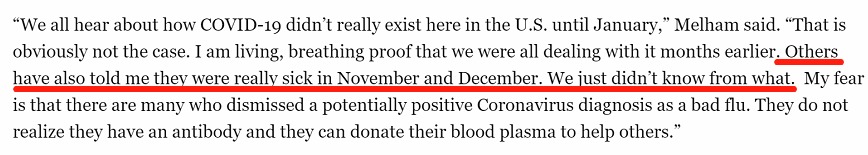 梅勒姆认为,此前许多重症流感很可能就是新冠肺炎,他身边也有很多人曾在去年11、12月生病且症状严重。