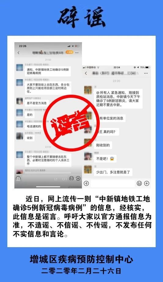 近日,网上流传一则“中新镇地铁工地确诊5例新冠病毒病例”的信息,对此,增城区疾病预防控制中心表示,经核实,此消息为谣言。