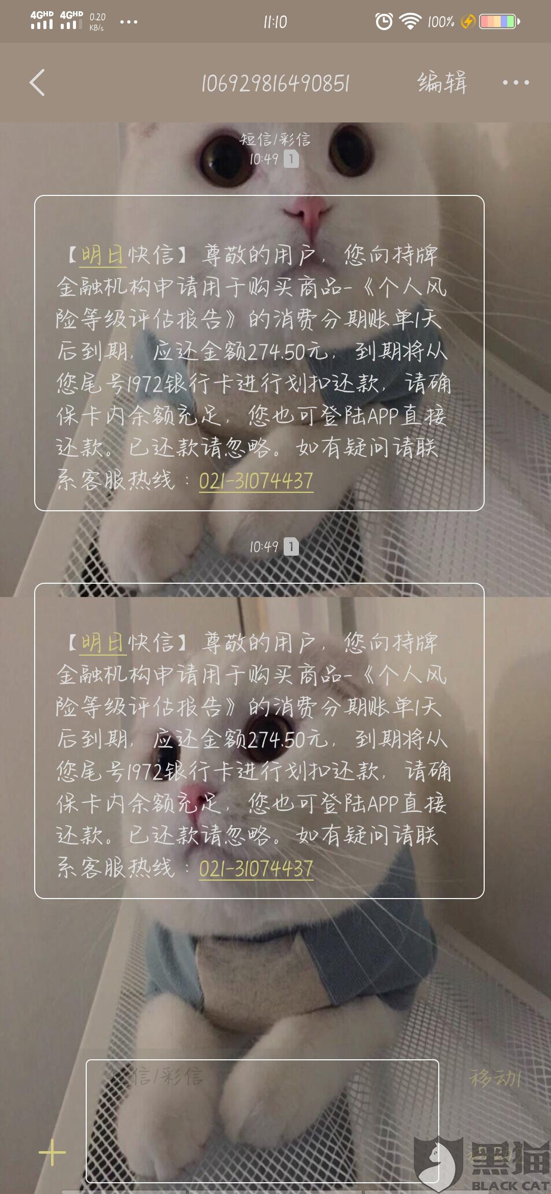 消费者“阿七呀ool”在5月5日向黑猫投诉平台反映:“最近因为疫情原因一直在家,手头上的资金周转困难,就想着借点钱周转一下,昨天刚在明日快信上填了信息,就要求支付,当时我就取消了,可是今天忽然收到了短信说在明日快信上购买了一个什么个人风险等级评估报告,要求扣款”