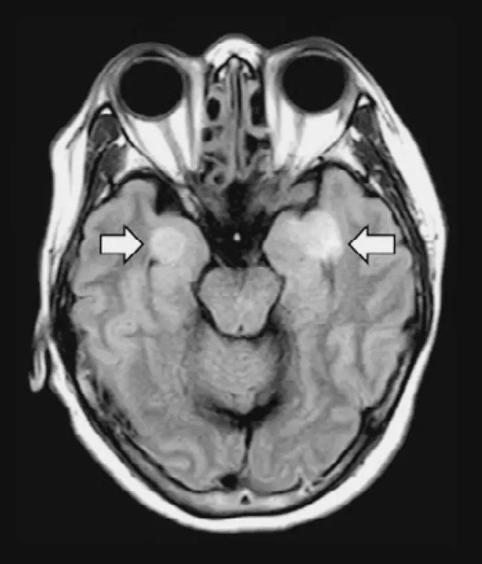 一名患有COVID-19的58岁女性患了脑炎,导致大脑组织受损(箭头)