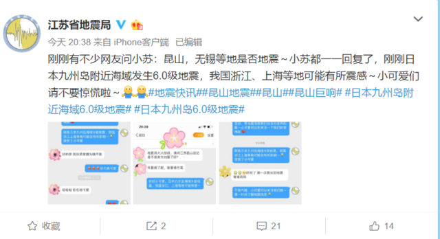 3日晚上,在@江苏省地震局微博下,也有不少网友留言称,江苏南部如昆山、无锡等地也有震感。“昆山城西29楼,有几分钟是感觉楼在晃,还以为隔壁打桩造成的。”“江苏昆山18楼震感明显。”“昆山刚刚晃得很明显啊!”