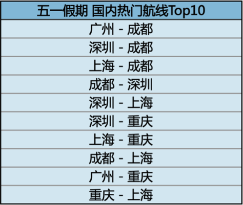 截至5月5日,广州-成都航线是五一假期排名第一热门的航线,上海-成都排在第三,机票平均支付价格较今年清明假期增长44%、裸票价格达到690元。上海-重庆航线也排名前列,平均支付价格较清明增长了17%。