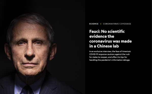 图说:美国《国家地理》杂志网站刊文《福奇:没有科学证据显示新冠病毒来自中国的实验室》。GJ