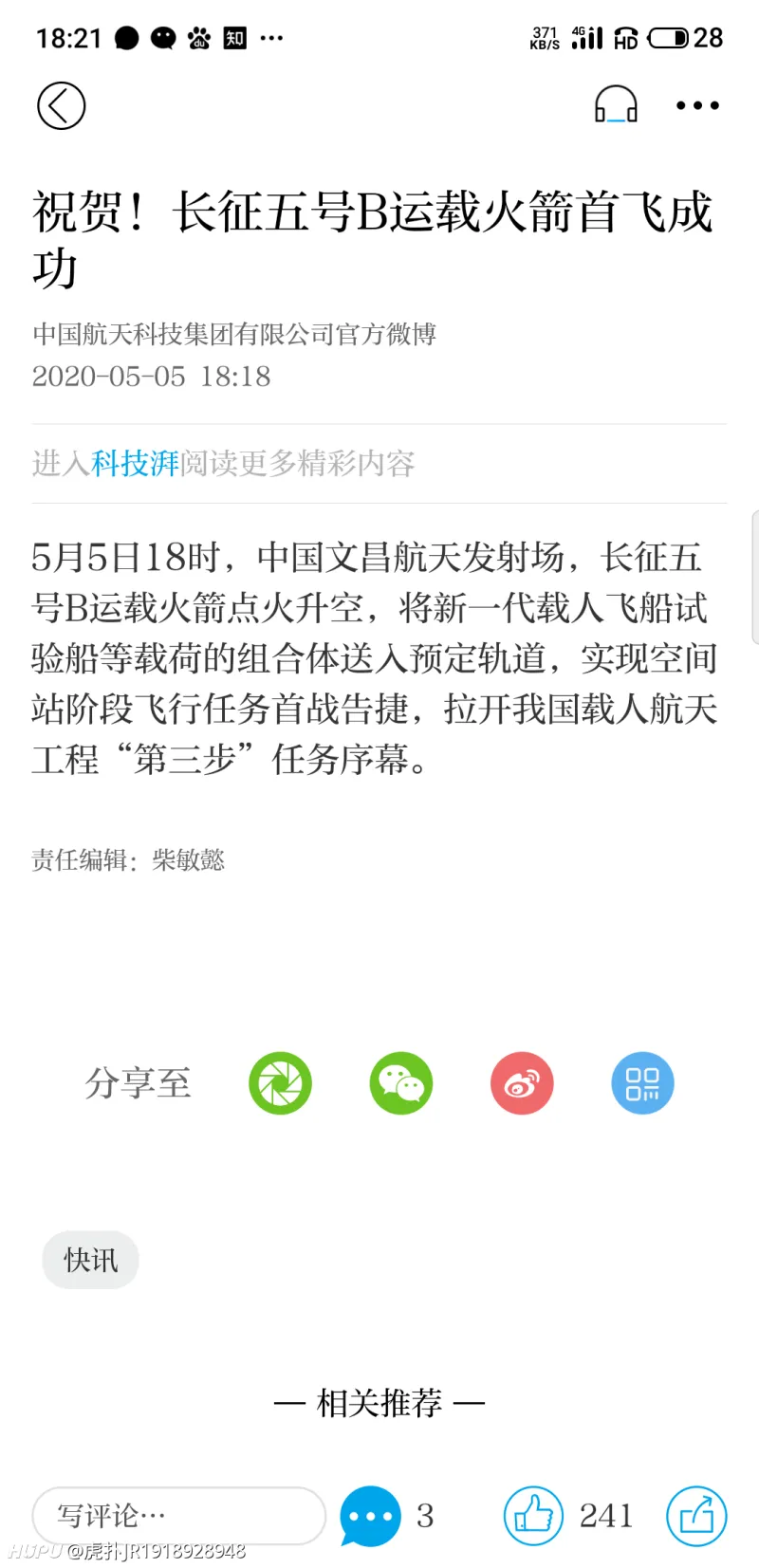 长征五b首飞成功新闻 网友亮评论:中国航天nb