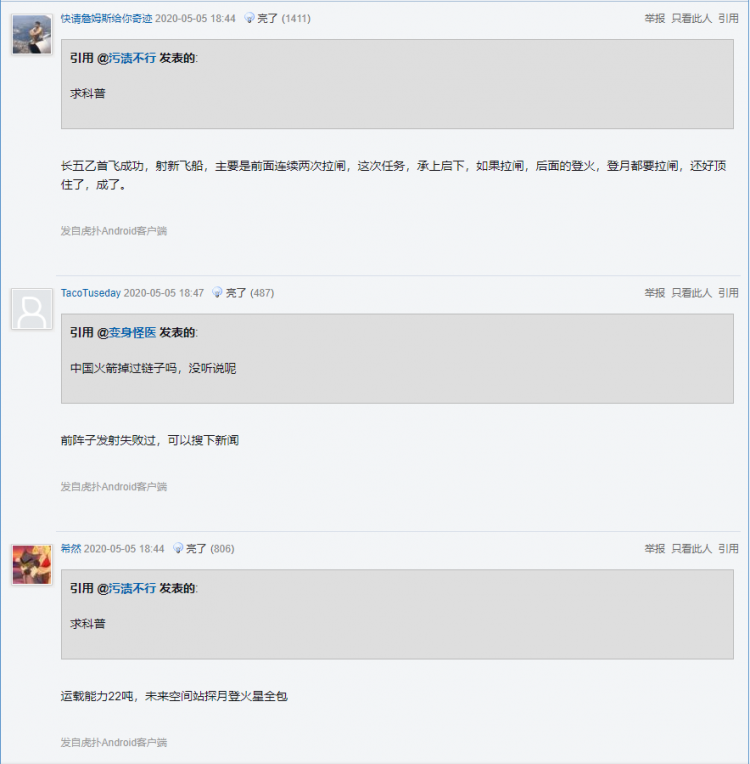 虎扑5月6日讯5月5日,中国文昌航天发射场,长征五号B运载火箭点火升空成功,实现空间站阶段飞行任务首站告捷。新闻发出后引起了网友的广泛讨论,详细内容如下: